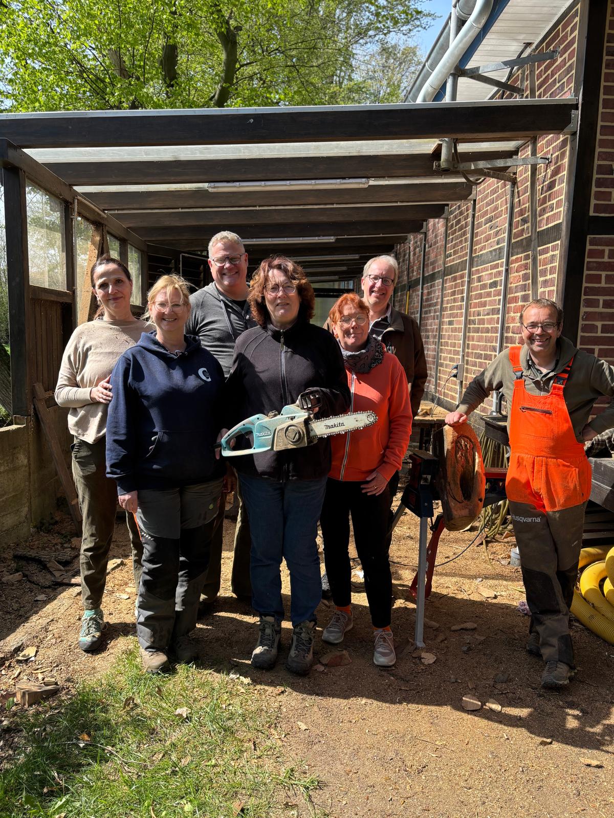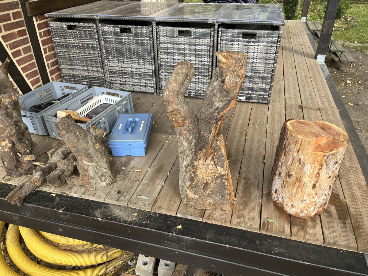 Saisonstart für Holzskulpturen.Am 20. März war es so weit. Bei bestem Wetter rückten Thomas und Maarten dem Kirschholz mit der Kettensäge und Fräsen auf den Leib. Maarten brachte sich als erfahrener Holzkünstler seinen Kirschstamm aus dem eigenen Garten mit. Das noch helle Holz verriet uns das die Fällung des Baumes noch gar nicht lange her war. Maarten legte für sich nur eine kreative Bedingung fest.