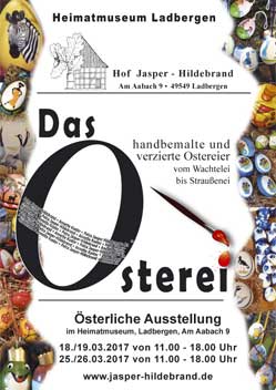 Wer dann noch nicht genug hat, der kann anschlißend auch noch nach Ladbergen fahren. Dort gibt es nämlich die alljährliche Ausstellung "Das Osterei". Wo? Im Heimatmuseum Am Aabach 9 in 49549 Ladbergen. Öffnungszeiten ebenfalls von 11 - 18 Uhr.