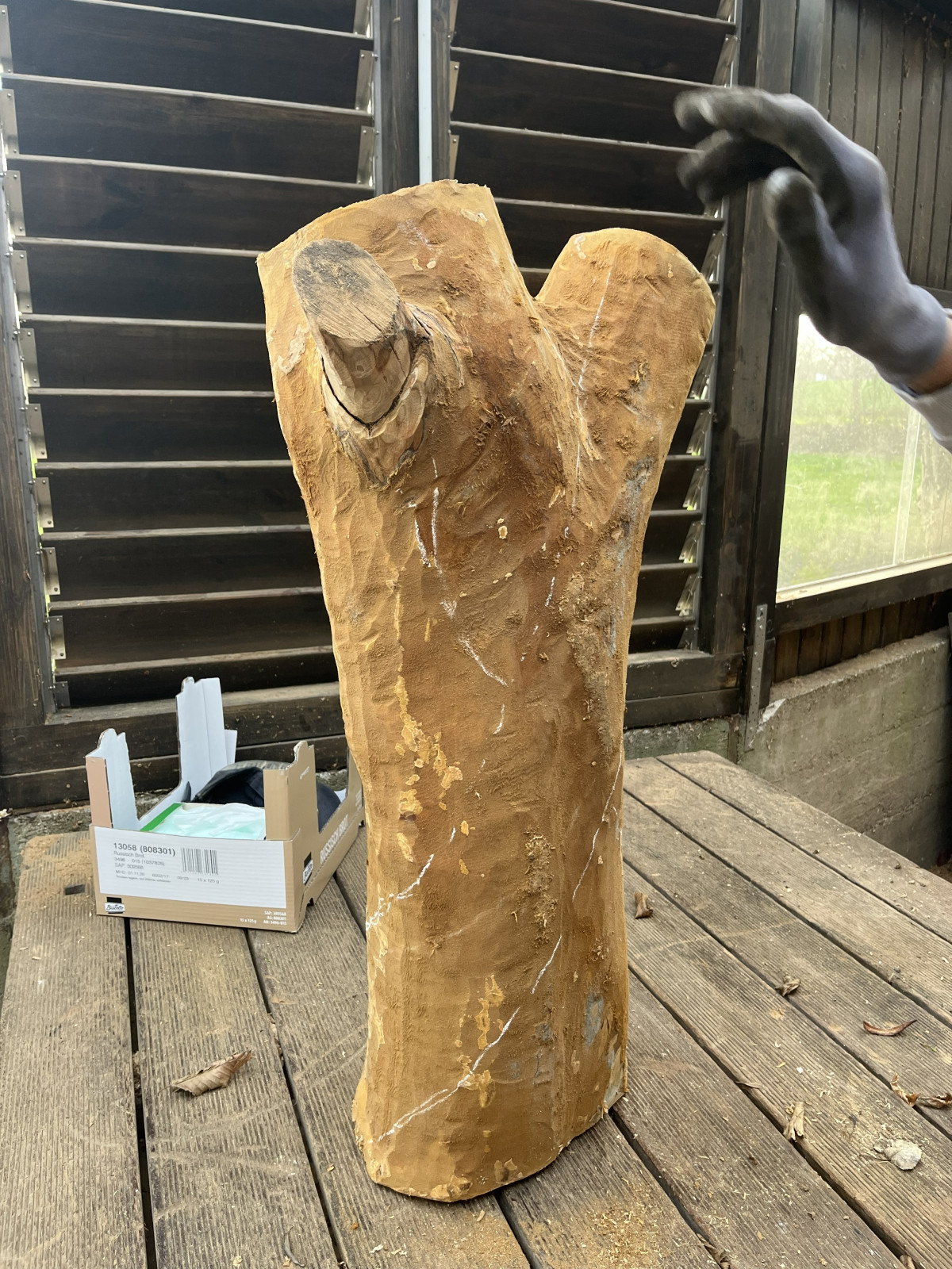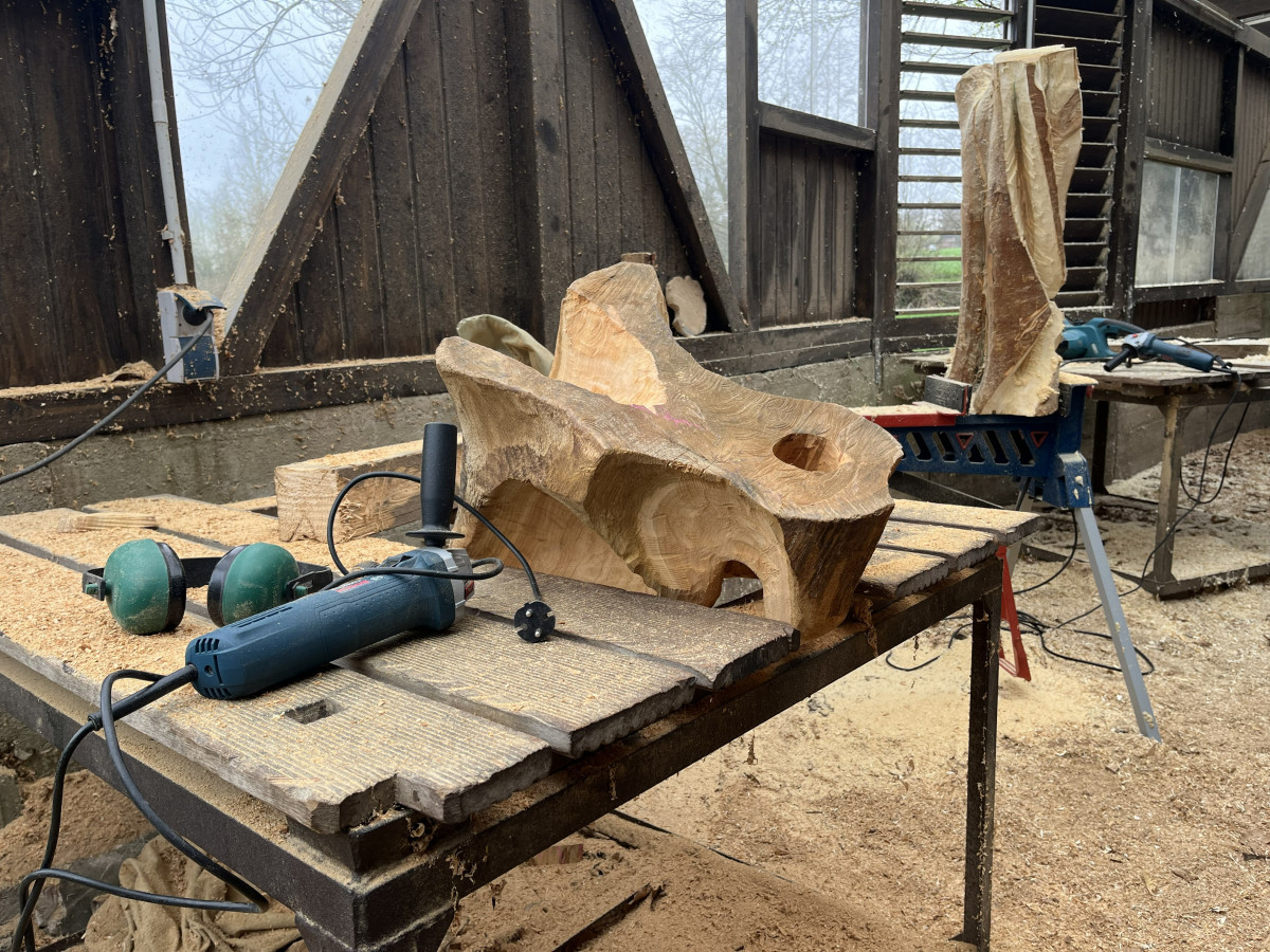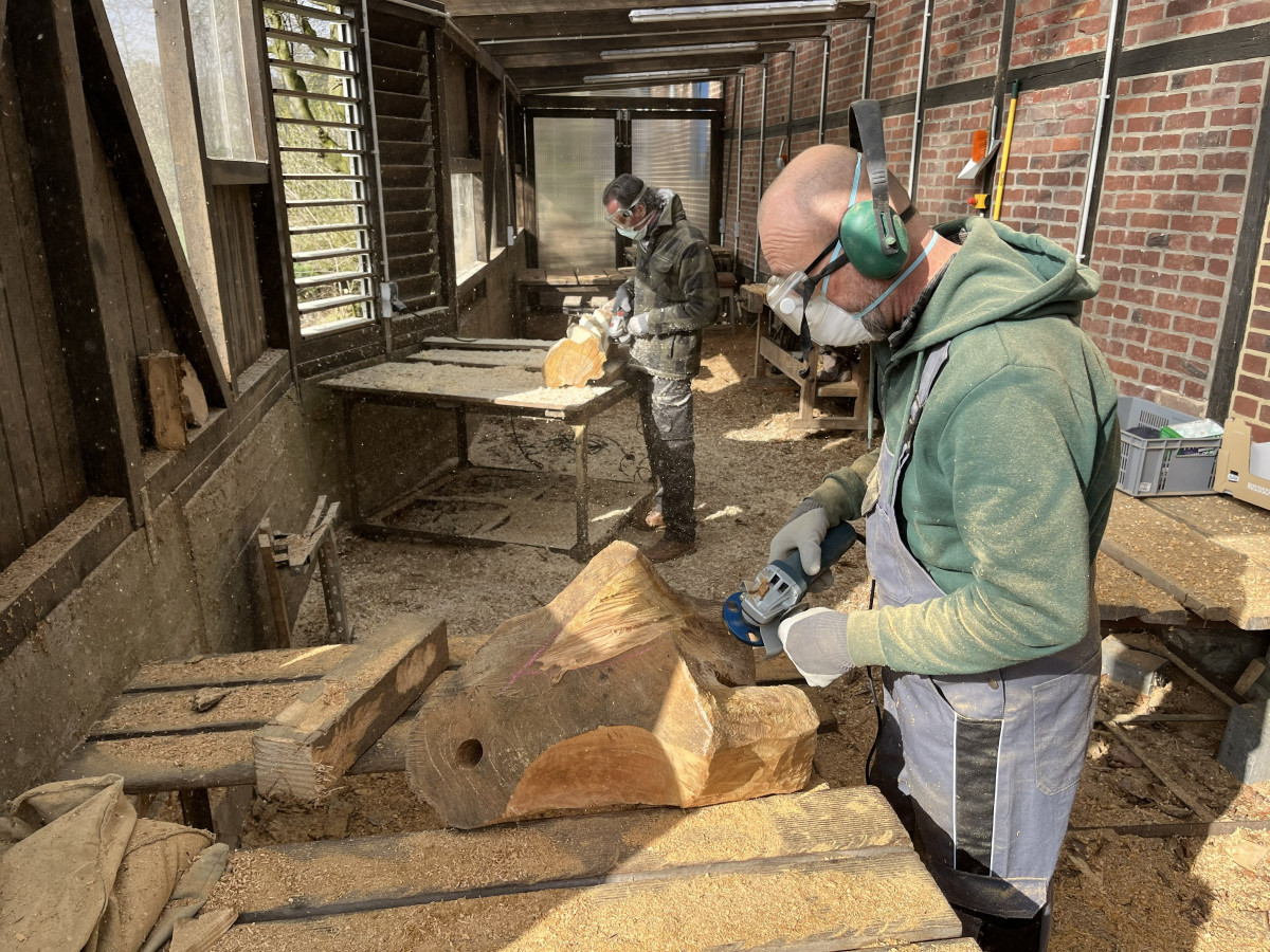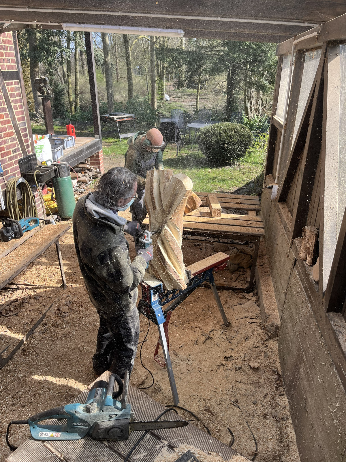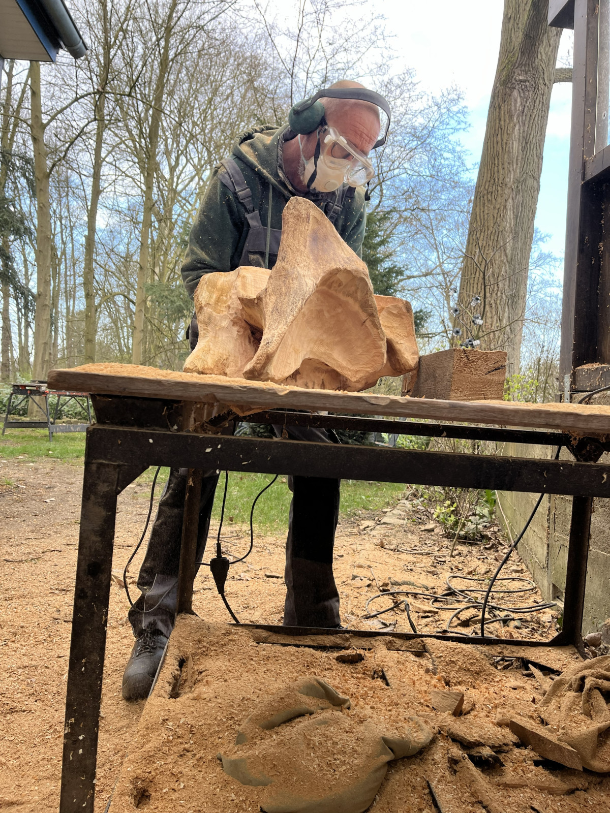 Am 20. März war es so weit. Bei bestem Wetter rückten Thomas und Maarten dem Kirschholz mit der Kettensäge und Fräsen auf den Leib. Maarten brachte sich als erfahrener Holzkünstler seinen Kirschstamm aus dem eigenen Garten mit. Das noch helle Holz verriet uns das die Fällung des Baumes noch gar nicht lange her war. Maarten legte für sich nur eine kreative Bedingung fest. Diesesmal kein (weiblicher) Torso. So bearbeitete das Holz unermüdlich und erstaunte mich mit seinem Mut und seiner Entscheidungsfreudigkeit.
