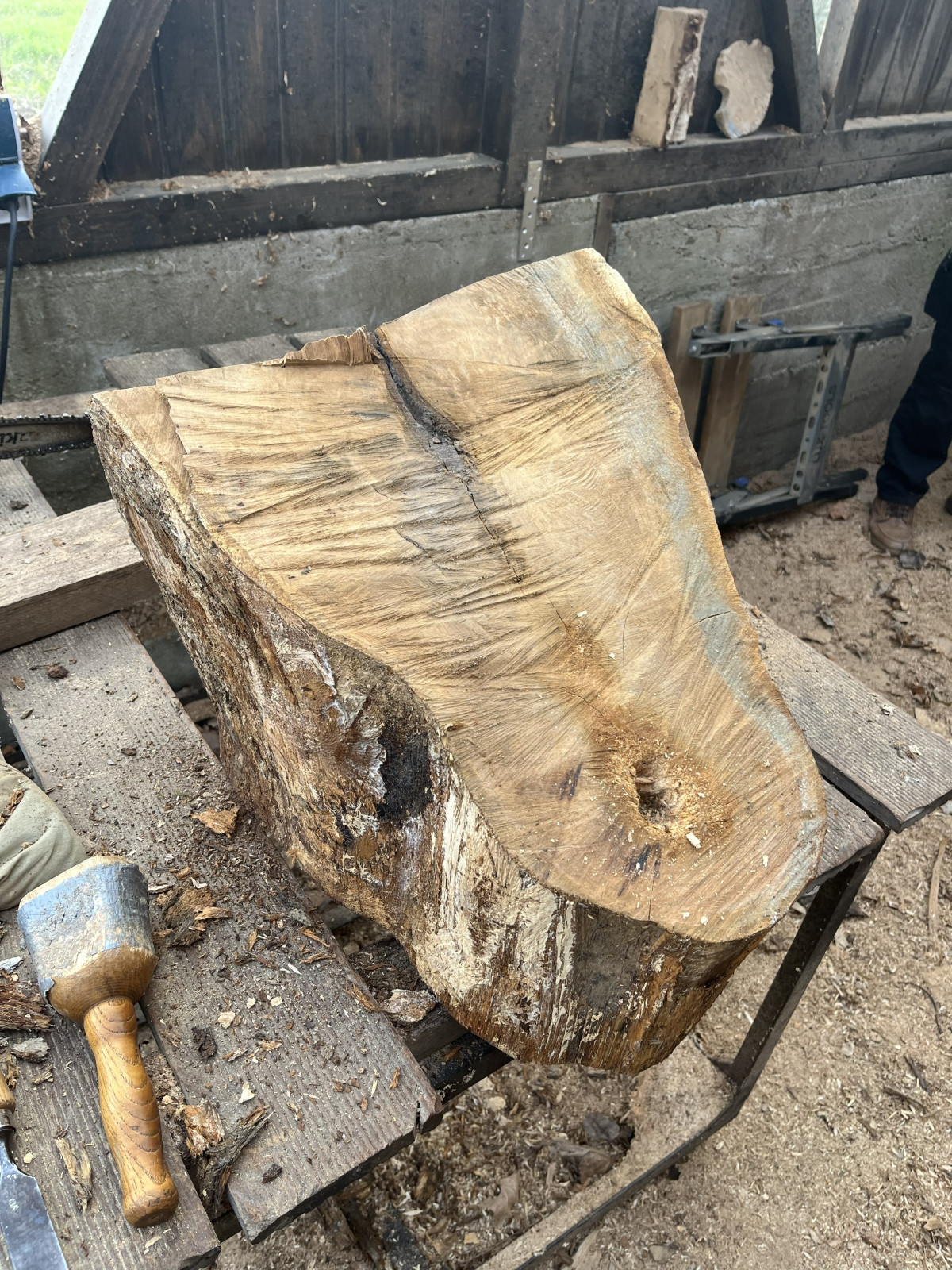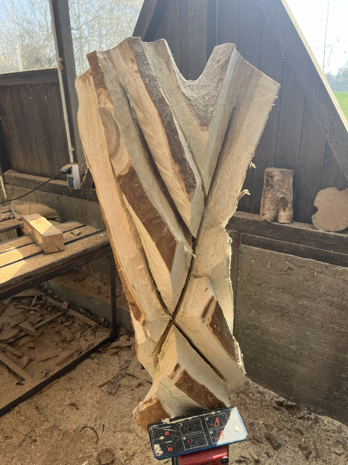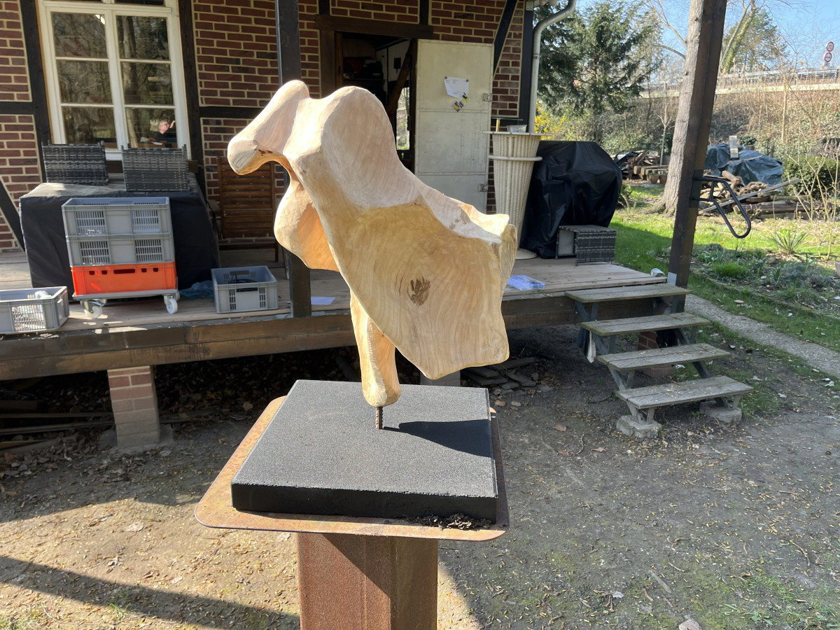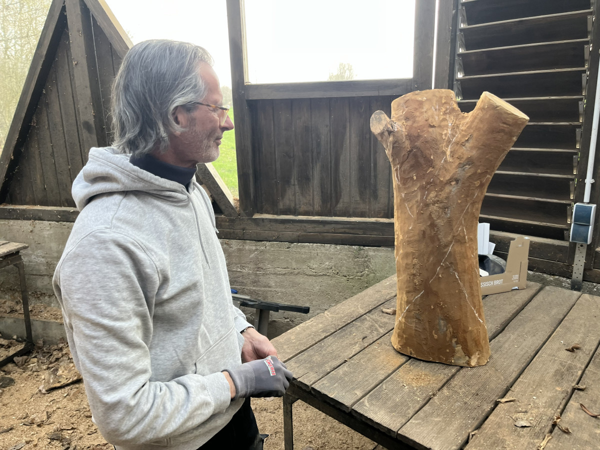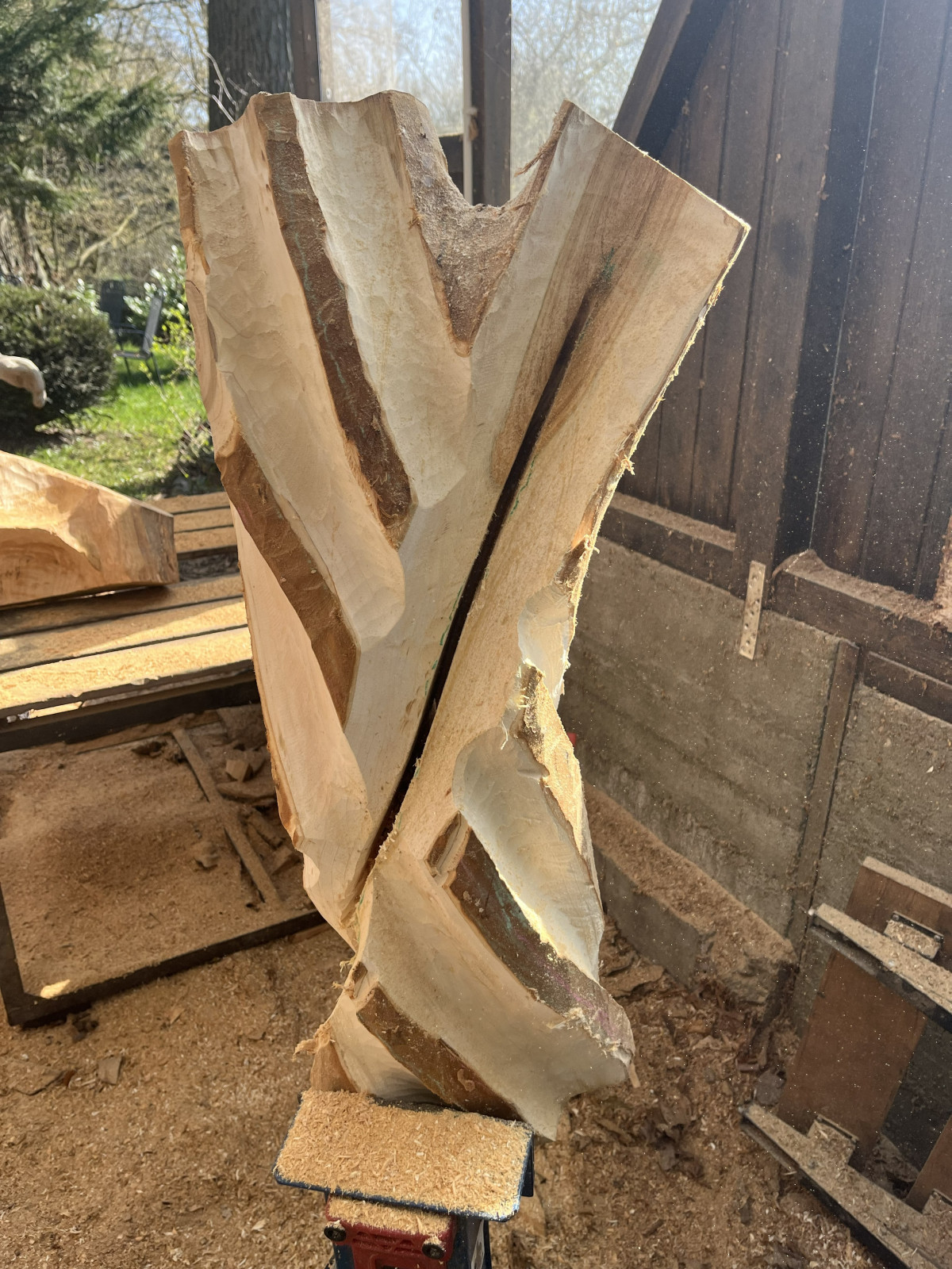 Am 20. März war es so weit. Bei bestem Wetter rückten Thomas und Maarten dem Kirschholz mit der Kettensäge und Fräsen auf den Leib. Maarten brachte sich als erfahrener Holzkünstler seinen Kirschstamm aus dem eigenen Garten mit. Das noch helle Holz verriet uns das die Fällung des Baumes noch gar nicht lange her war. Maarten legte für sich nur eine kreative Bedingung fest. Diesesmal kein (weiblicher) Torso. So bearbeitete das Holz unermüdlich und erstaunte mich mit seinem Mut und seiner Entscheidungsfreudigkeit.