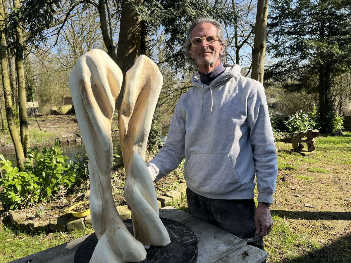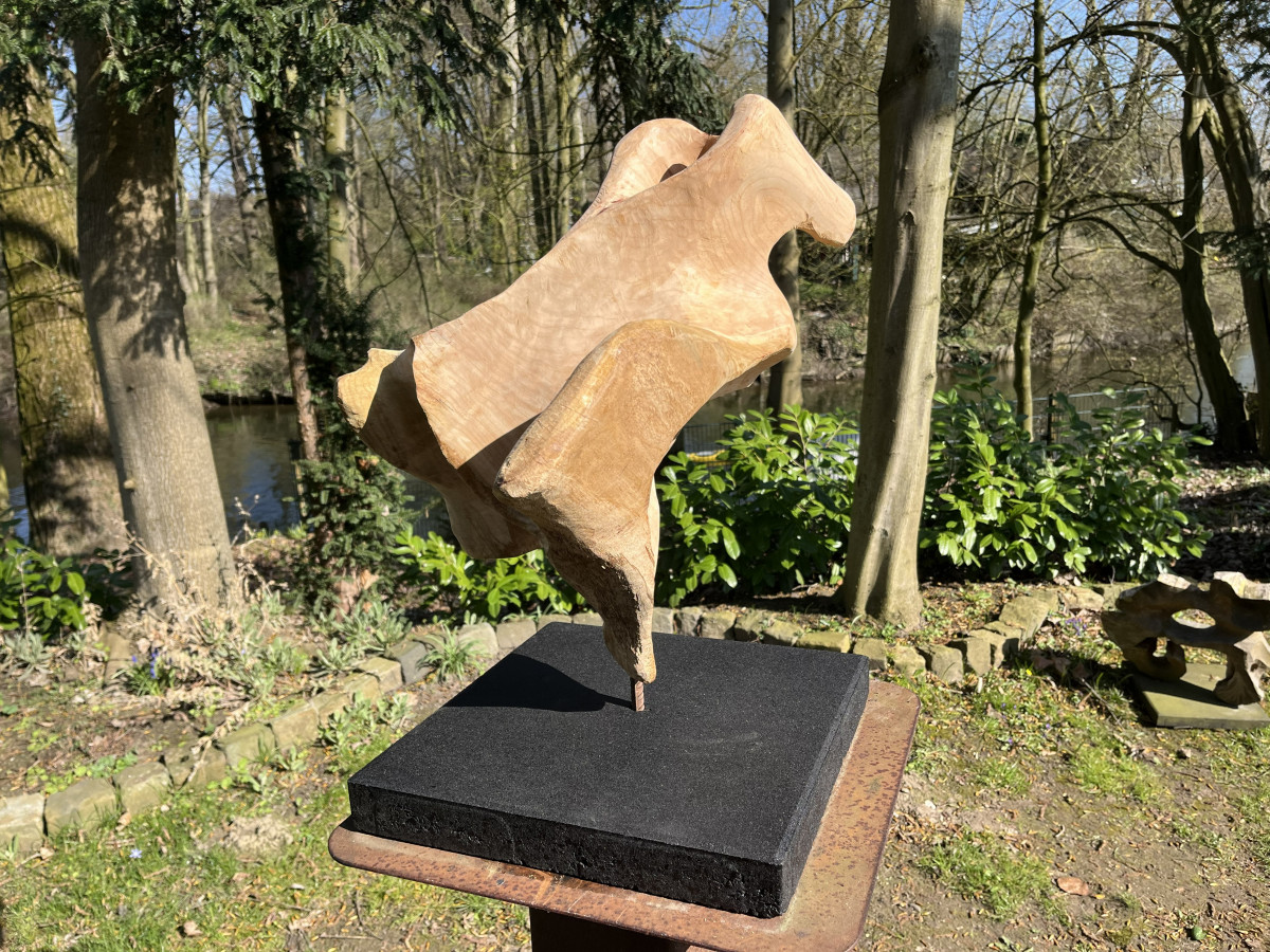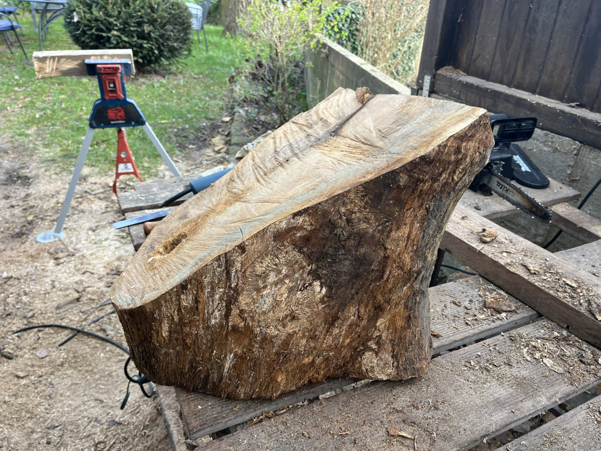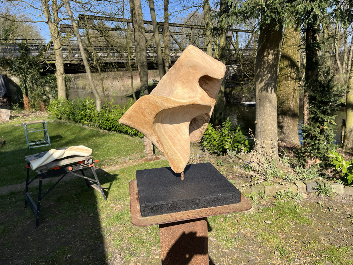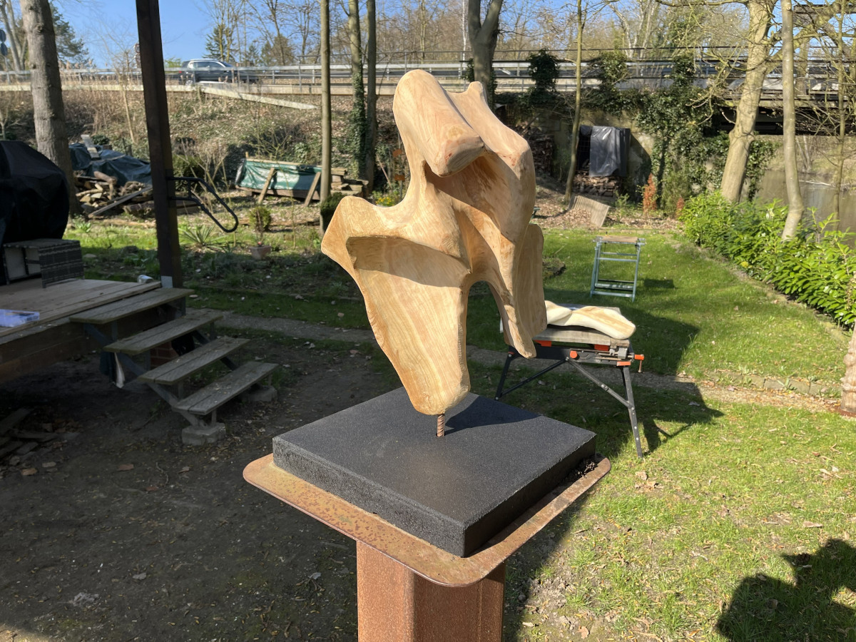 Am 20. März war es so weit. Bei bestem Wetter rückten Thomas und Maarten dem Kirschholz mit der Kettensäge und Fräsen auf den Leib. Maarten brachte sich als erfahrener Holzkünstler seinen Kirschstamm aus dem eigenen Garten mit. Das noch helle Holz verriet uns das die Fällung des Baumes noch gar nicht lange her war. Maarten legte für sich nur eine kreative Bedingung fest. Diesesmal kein (weiblicher) Torso. So bearbeitete das Holz unermüdlich und erstaunte mich mit seinem Mut und seiner Entscheidungsfreudigkeit.