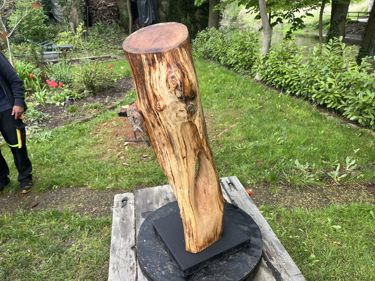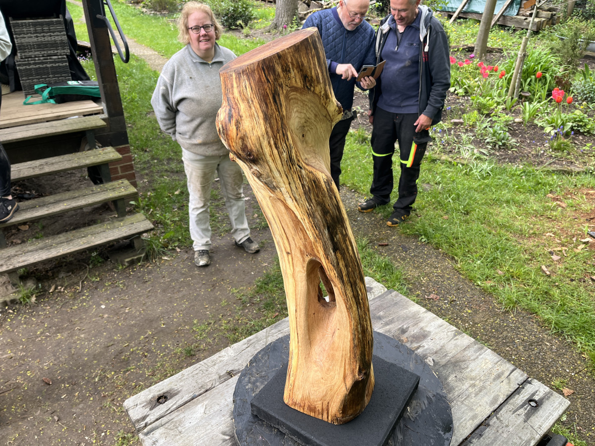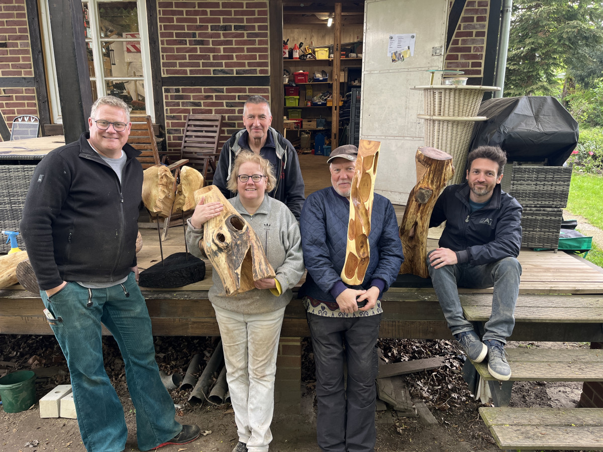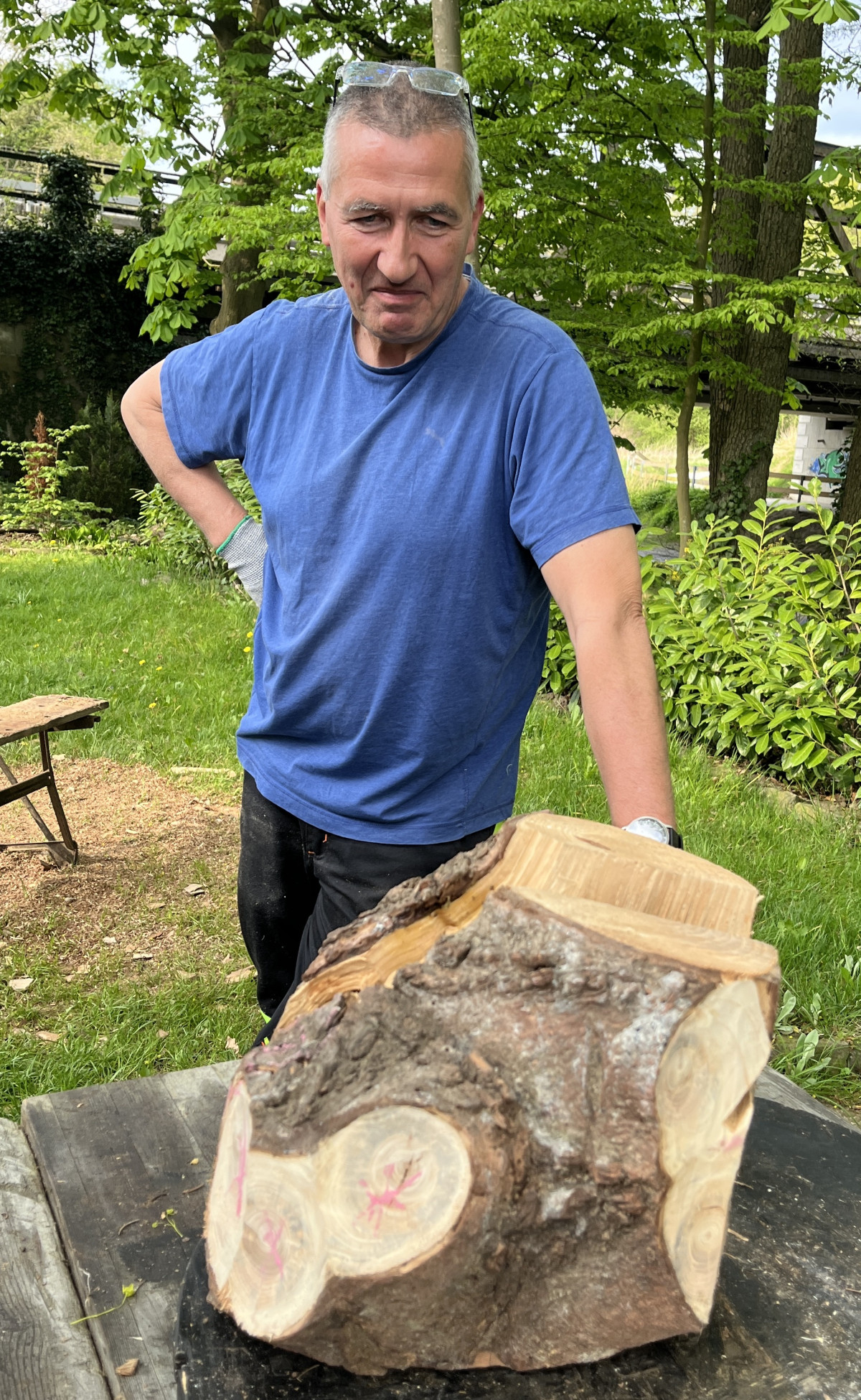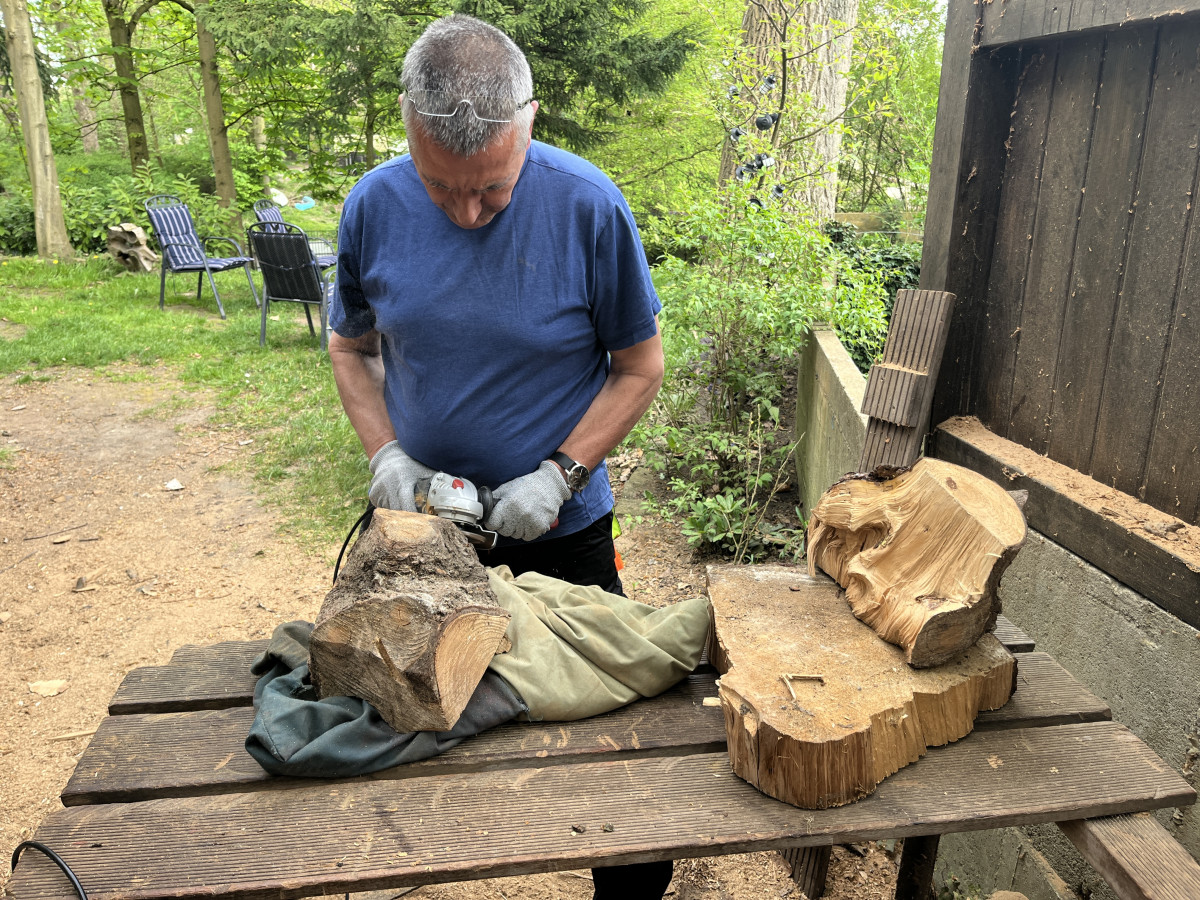 Mit einem vierteiligen Puzzle aus der eigenen Fichte reiste Steffen aus dem fernen Berlin an. Seine eigene Vorgabe, ich möchte aus min. 3 Stücken eine Skulptur erstellen, fand ich einen wundervollen kreativen Rahmen. So begann er seine kreative Reise genauso wie Youssif der sich einen Rohling aus Eiche aussuchte und ebenfalls Schritt für Schritt dem Wuchs des Holzes nachging. Steffens gespaltene Fichte war bestimmt nichts für Ludger. Ludger legte viel Wert auf rissfreies Holz und zum Glück wurden wir uns einig welche mitgebrachten Rohlinge nicht mehr seine Heimreise in Sauerland antreten werden. Ich glaube ich muss ihn mal mit einem Anhänger besuchen kommen.