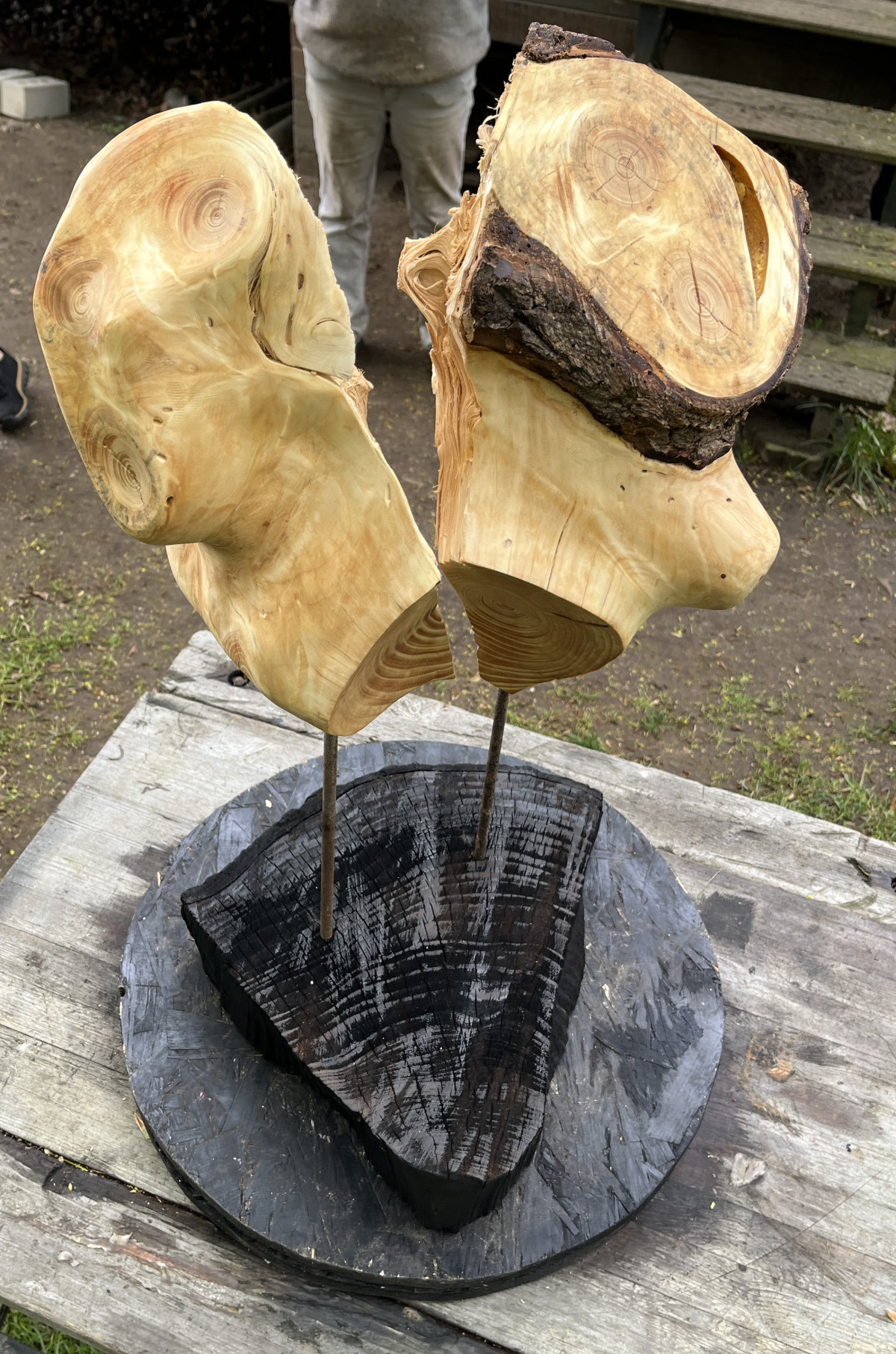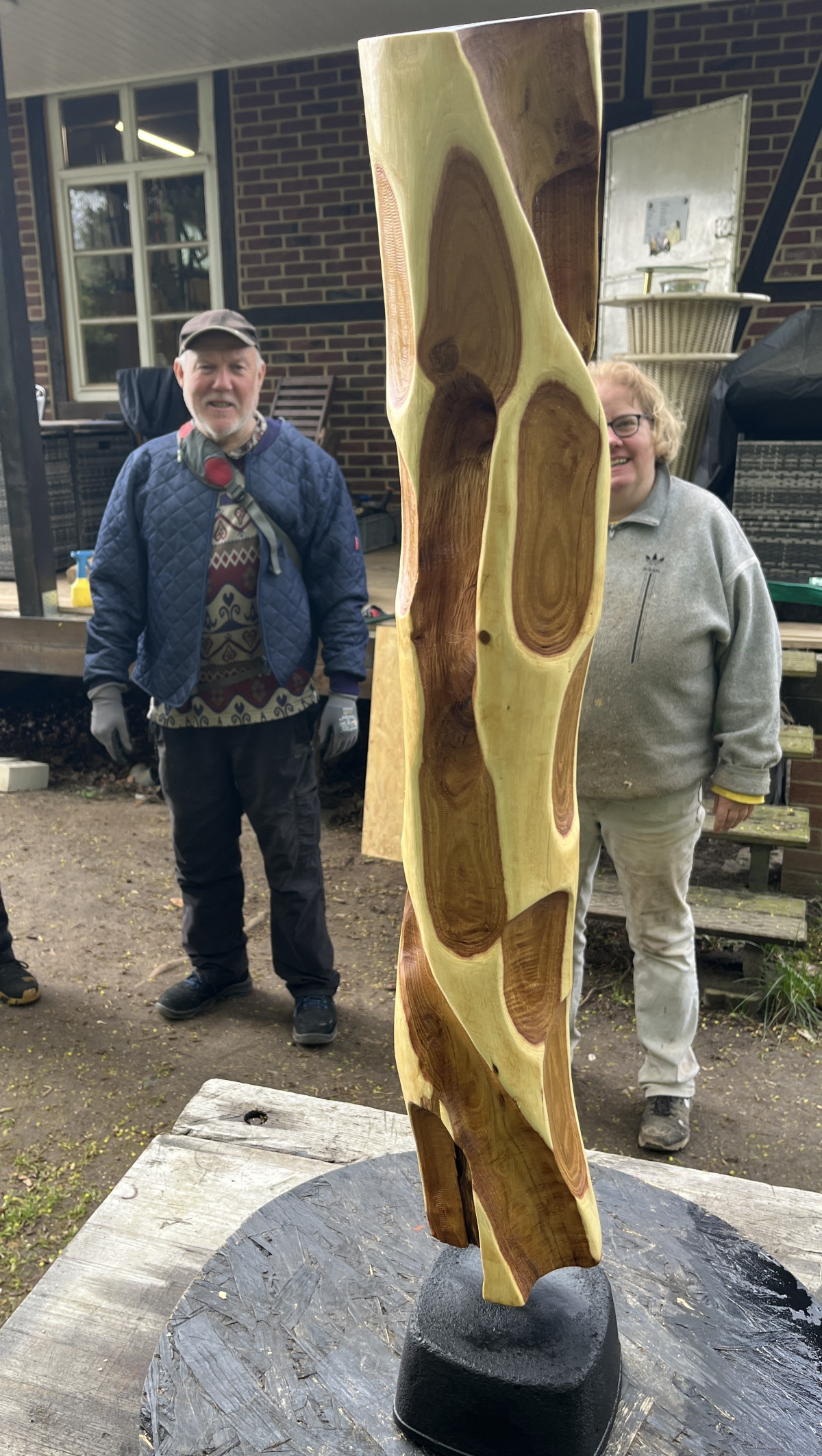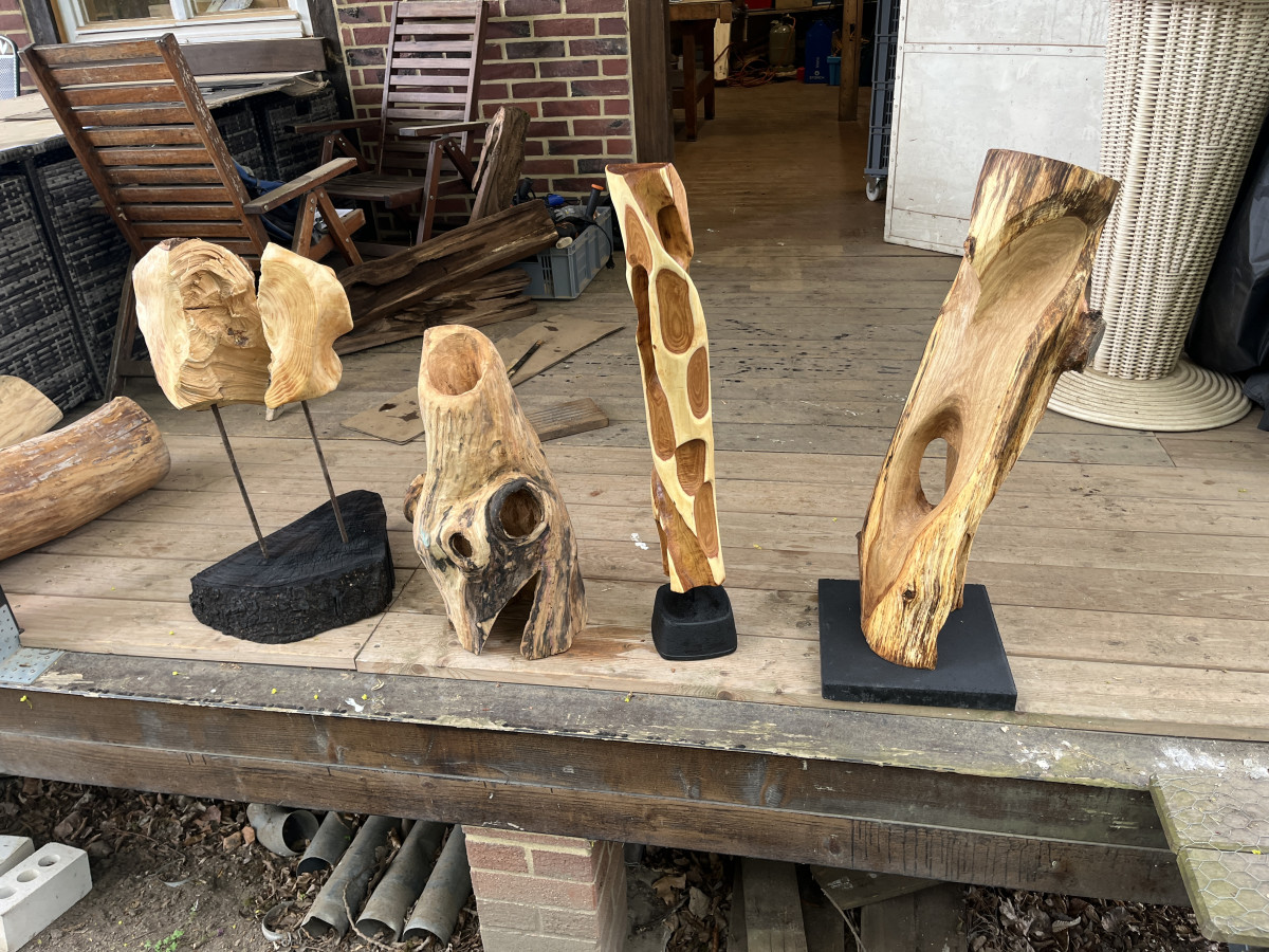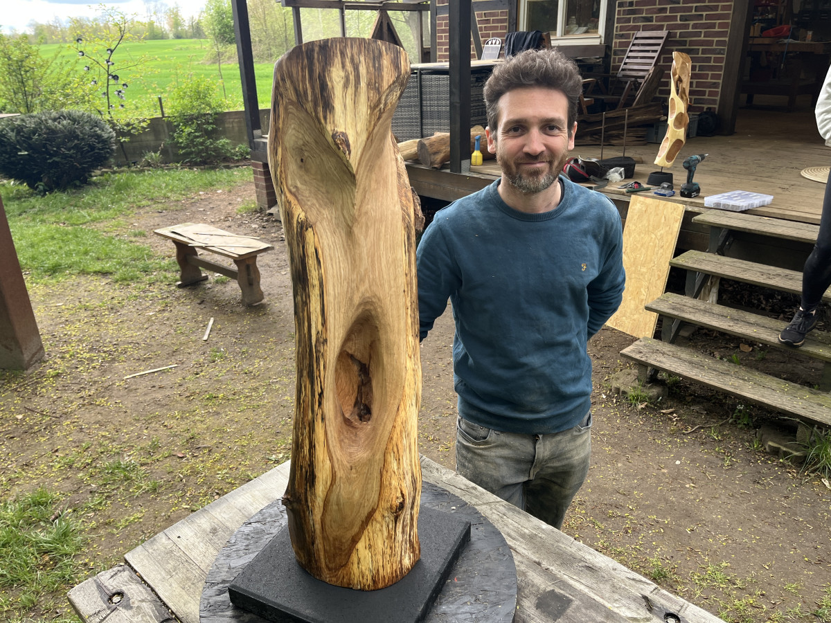 Mit einem vierteiligen Puzzle aus der eigenen Fichte reiste Steffen aus dem fernen Berlin an. Seine eigene Vorgabe, ich möchte aus min. 3 Stücken eine Skulptur erstellen, fand ich einen wundervollen kreativen Rahmen. So begann er seine kreative Reise genauso wie Youssif der sich einen Rohling aus Eiche aussuchte und ebenfalls Schritt für Schritt dem Wuchs des Holzes nachging. Steffens gespaltene Fichte war bestimmt nichts für Ludger. Ludger legte viel Wert auf rissfreies Holz und zum Glück wurden wir uns einig welche mitgebrachten Rohlinge nicht mehr seine Heimreise in Sauerland antreten werden. Ich glaube ich muss ihn mal mit einem Anhänger besuchen kommen.