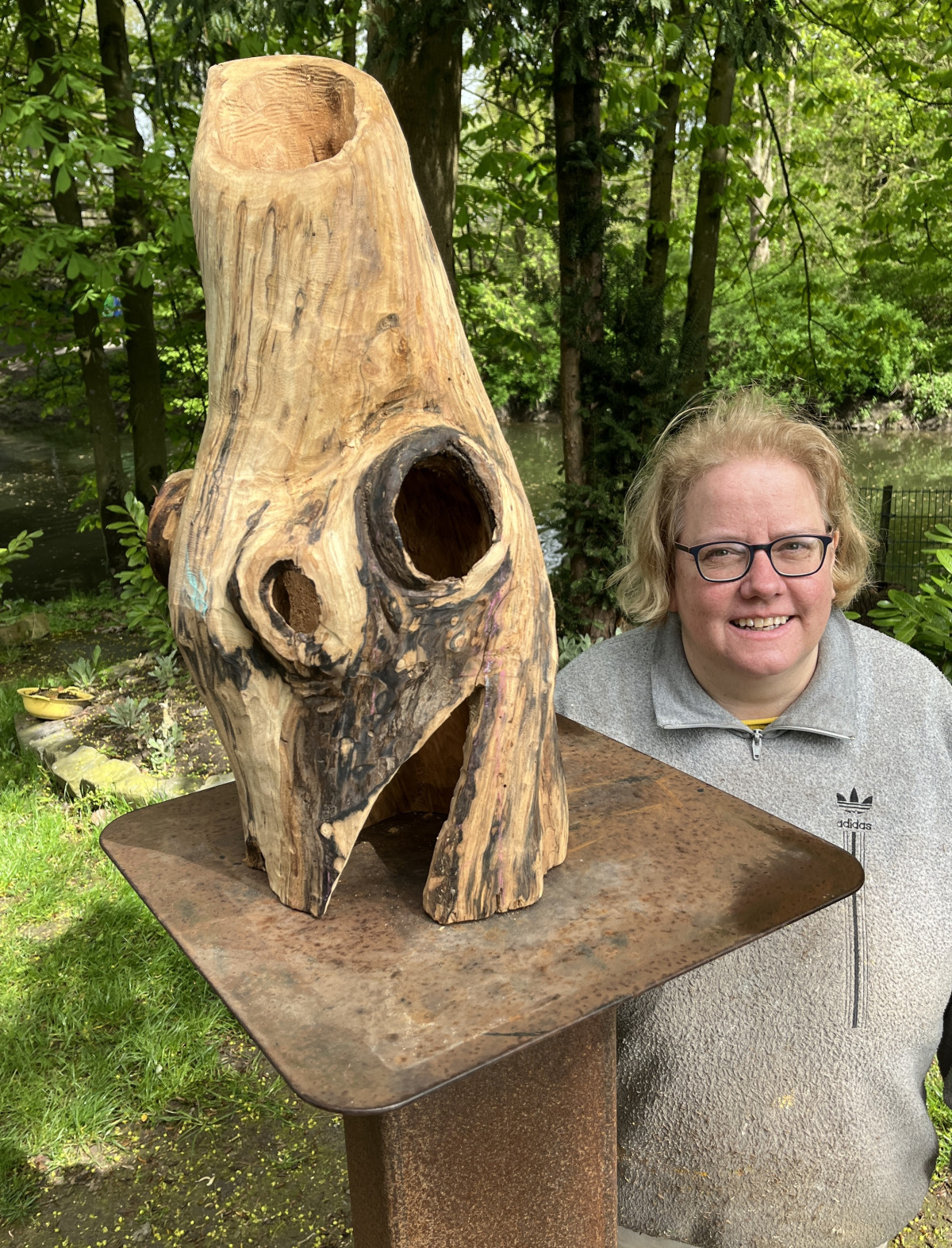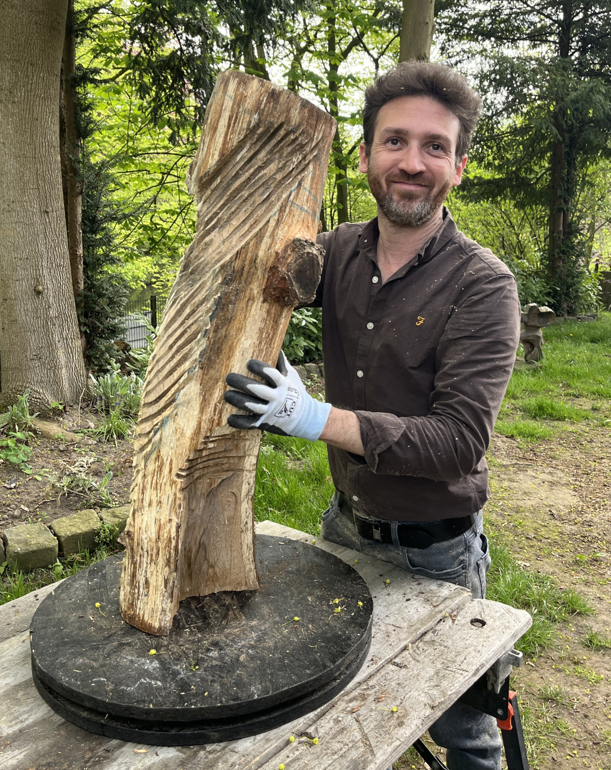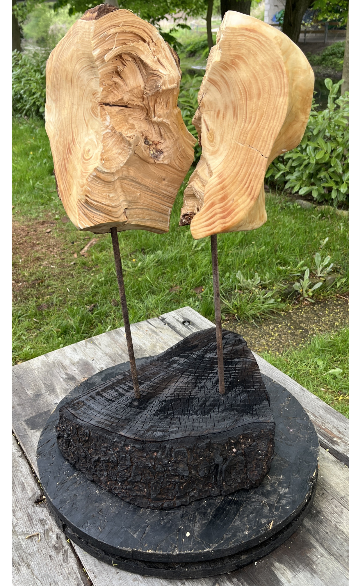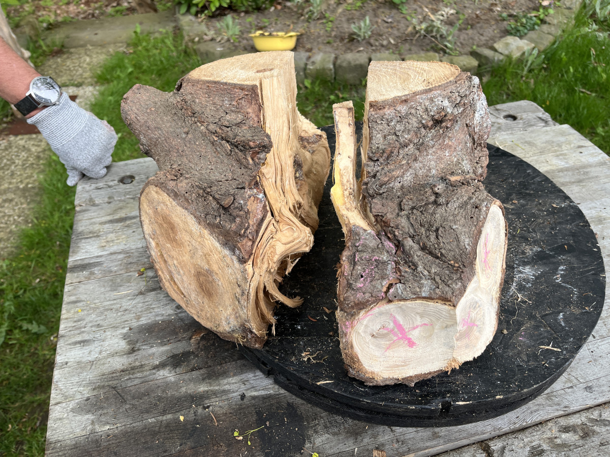 Mit einem vierteiligen Puzzle aus der eigenen Fichte reiste Steffen aus dem fernen Berlin an. Seine eigene Vorgabe, ich möchte aus min. 3 Stücken eine Skulptur erstellen, fand ich einen wundervollen kreativen Rahmen. So begann er seine kreative Reise genauso wie Youssif der sich einen Rohling aus Eiche aussuchte und ebenfalls Schritt für Schritt dem Wuchs des Holzes nachging. Steffens gespaltene Fichte war bestimmt nichts für Ludger. Ludger legte viel Wert auf rissfreies Holz und zum Glück wurden wir uns einig welche mitgebrachten Rohlinge nicht mehr seine Heimreise in Sauerland antreten werden. Ich glaube ich muss ihn mal mit einem Anhänger besuchen kommen.